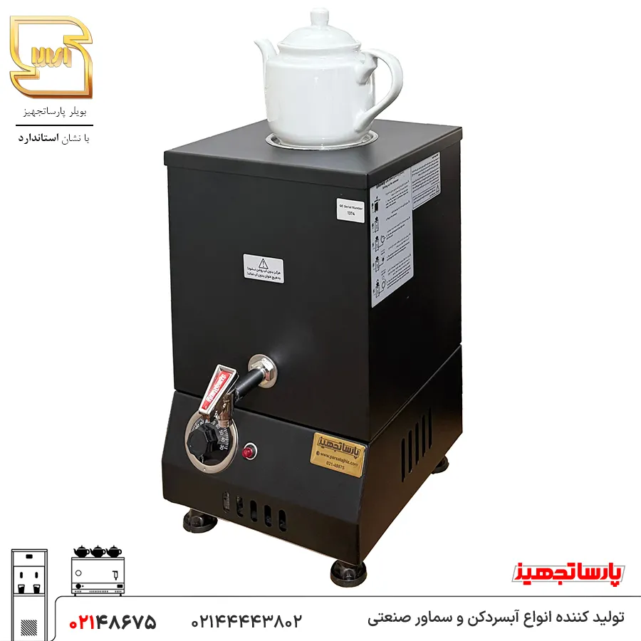 بویلر برقی 15 لیتری مشکی پارساتجهیز دارای شناور جنس برنج و مخصوص استفاده در آب جوش می باشد، که وسیله ای ضروری برای آبگیری آسان و خودکار از طریق اتصال به شیر آب است. حجم 15 لیتری بویلر ظرفیت تولید آب جوش برای 40 تا 60 نفر را دارد.