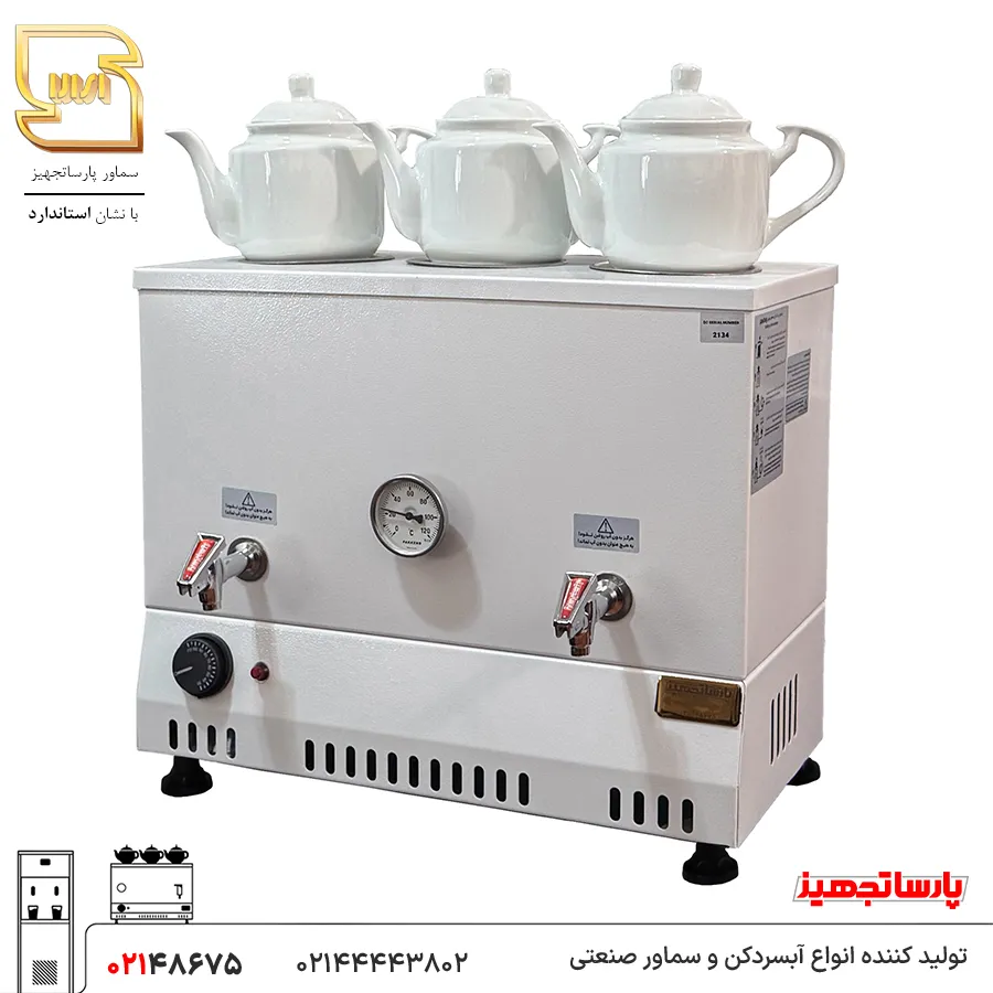 سماور برقی 30 لیتری استیل سفید سماوری بزرگ و صنعتی با نشان استاندارد ملی می باشد، حجم فوق العاده 32 لیتری مخزن برای نگهداری آب جوش و برخورداری از 3 عدد جای قوری، بالاترین کارایی و بهره وری را برای شما دارد.